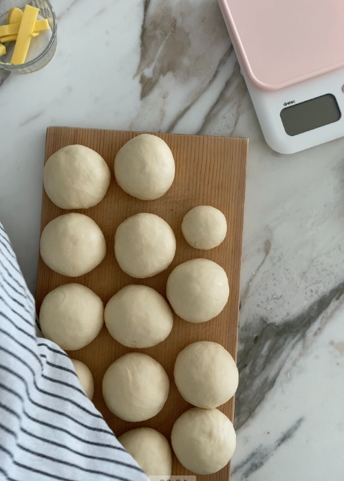 발뮤다 더레인지 사이즈가 작아서 먼저 성형한 반죽 6개는 전원꺼진 오븐에 넣고 뜨거운 물을 같이 넣어주었고, 나중에 성형한 6개는 천 두 장을 덮어 실내(22도)에서 70분 정도 발효해 주었어요.