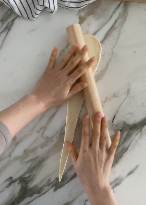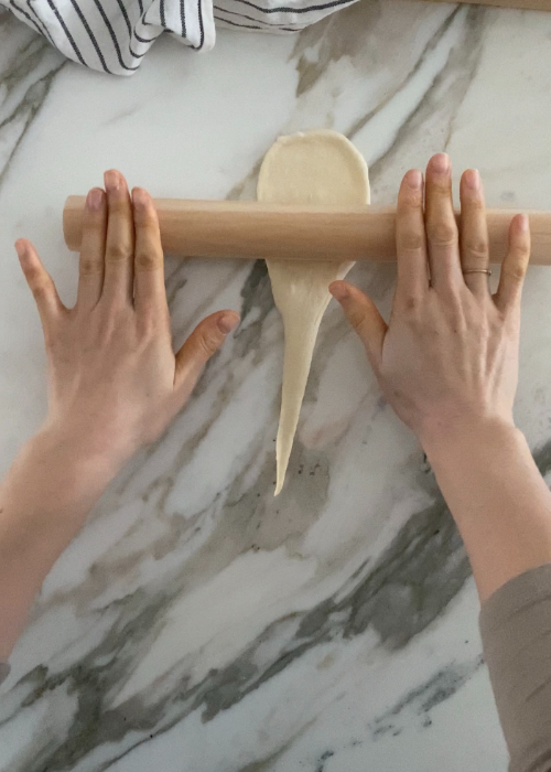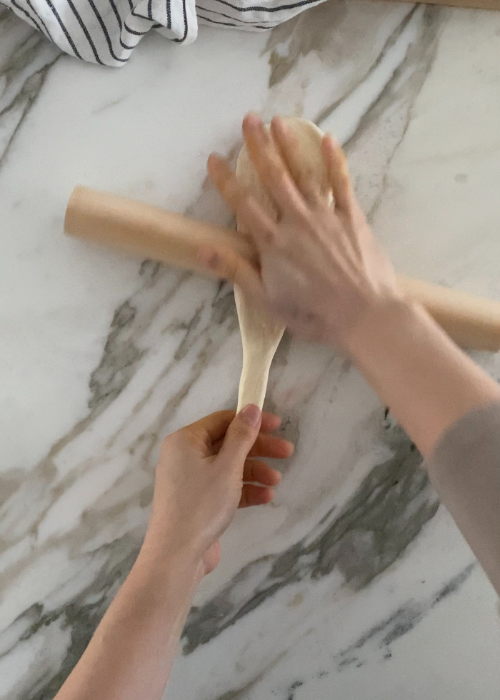 반죽을 손바닥으로 밀어가면서 모양을 잡아주세요.