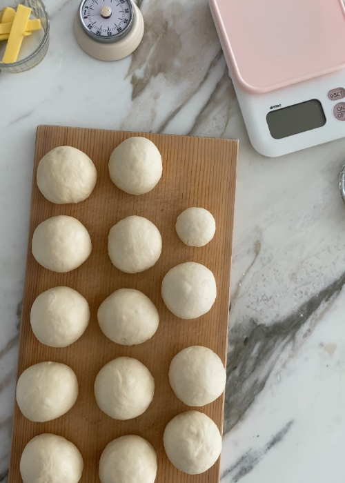 같은 양으로 반죽해도 양이 늘 달라지기에 전체 반죽 용량을 잰 후 같은 크기로 12등분 해 주세요.