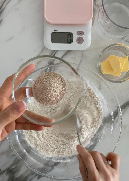강력분400g, 박력분100g, 소금10g, 설탕30g, 탈지분유30g, 이스트6g, 물330g, 반죽용 버터50g, 충전용 버터120g, 마무리용 버터 소량(버터는 모두 무염으로 사용했으나 충전용 버터는 가염을 사용해도 좋음)