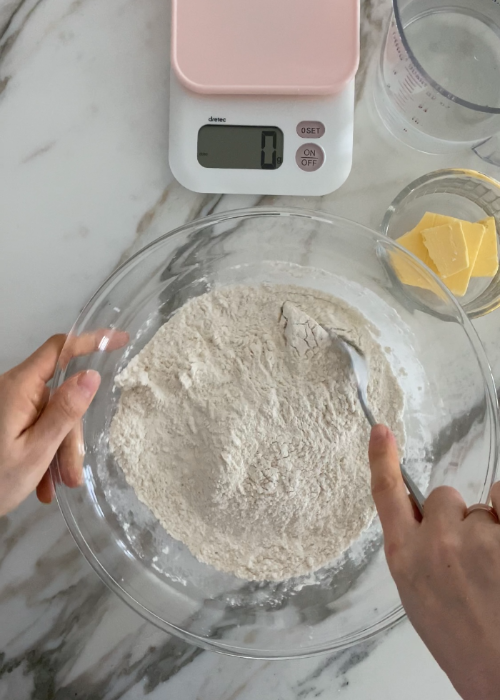 강력분, 박력분, 소금, 설탕, 탈지분유를 모두 한데 부어 포크로 가볍게 섞어주세요.